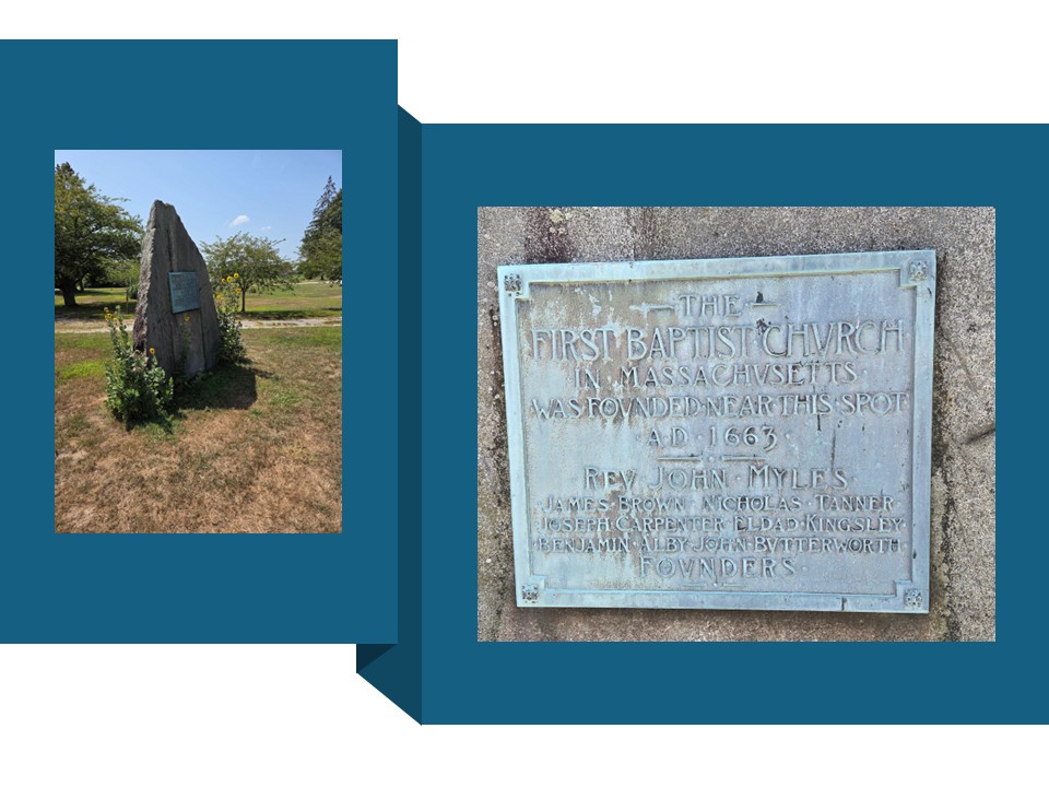 The actual date the physical church at Nockum Hill was constructed was not 1663, as written on the monument, but nearer to 1667, following John Myles’s expulsion from the Plymouth Colony Town of Rehoboth. Myles and other members of his congregation were fined and ordered to “remove theire meeting unto some other place, where they may not prejudice any other church.”