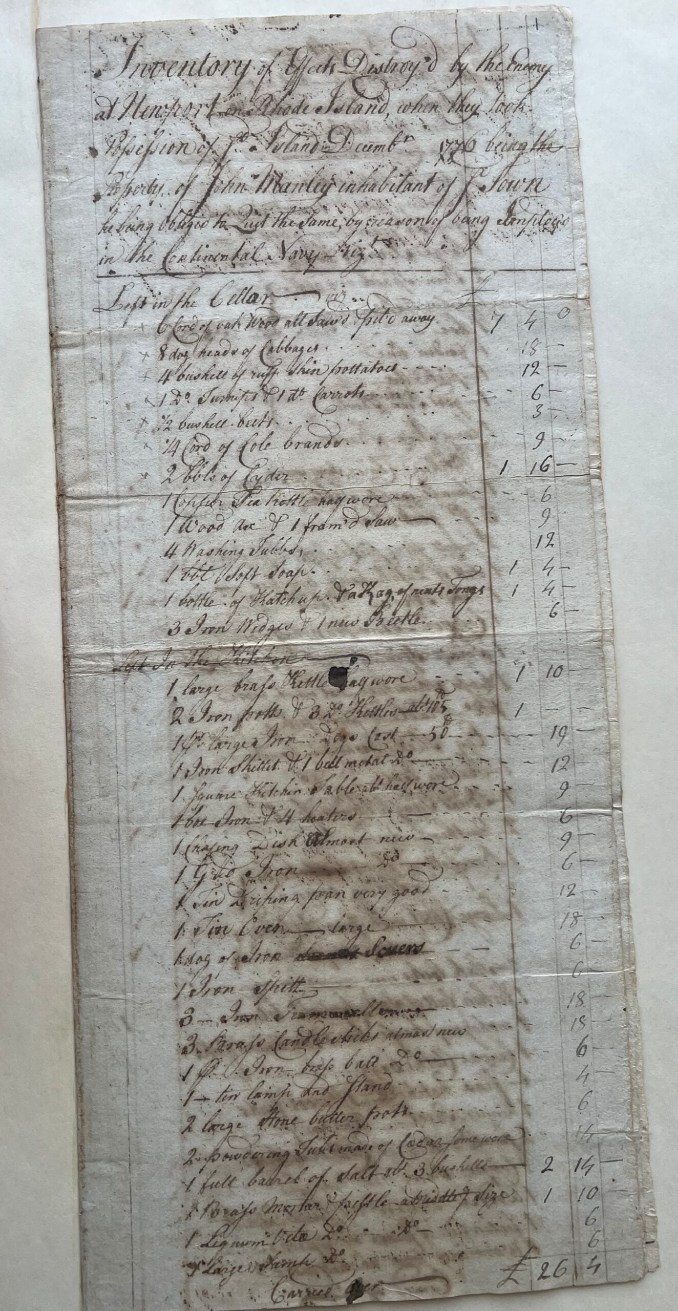 Inventory of Effects Destroy’d by the Enemy at Newport on Rhode Island, when they took Possession of ye Island in December 1776 being the property of John Manley inhabitant of ye Town he being obliged to Quit the Same, by reasoning of being employ’d in the Continental Navy, viz: